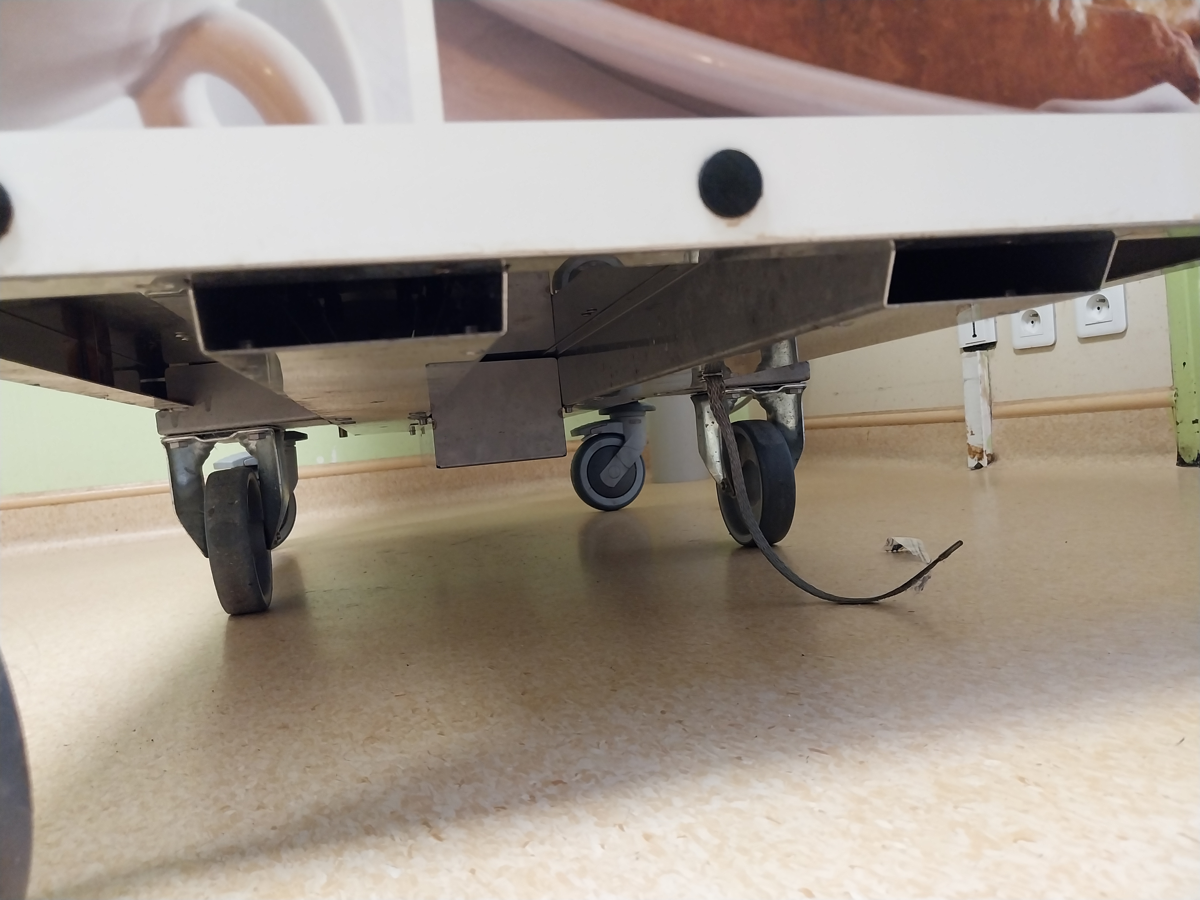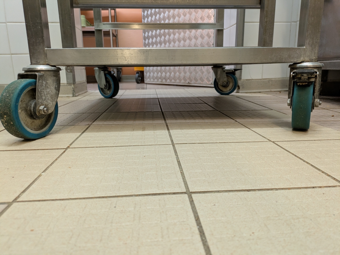 Embase de chariot composée de deux roues centrales fixes qui supportent la charge, et quatre roues pivotantes